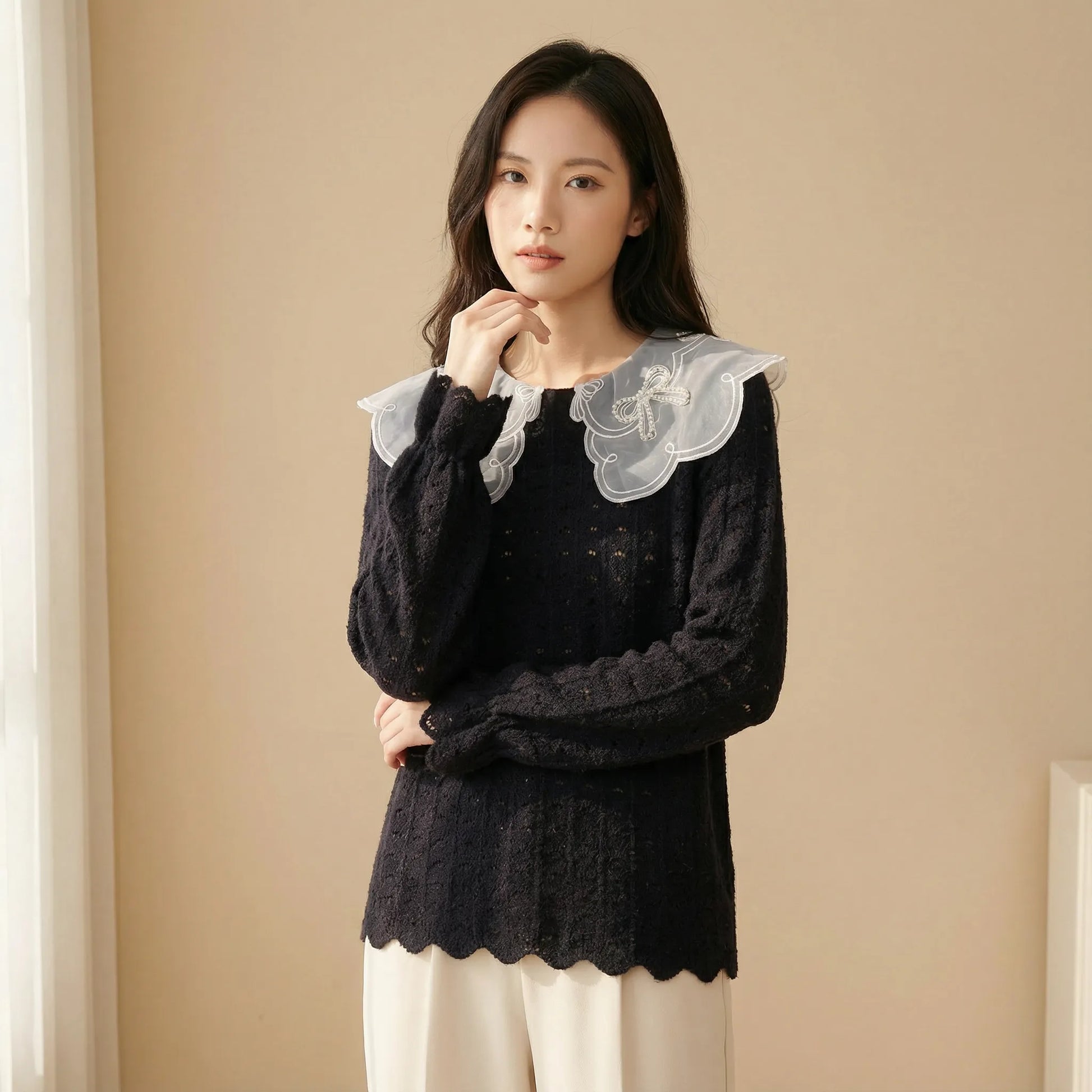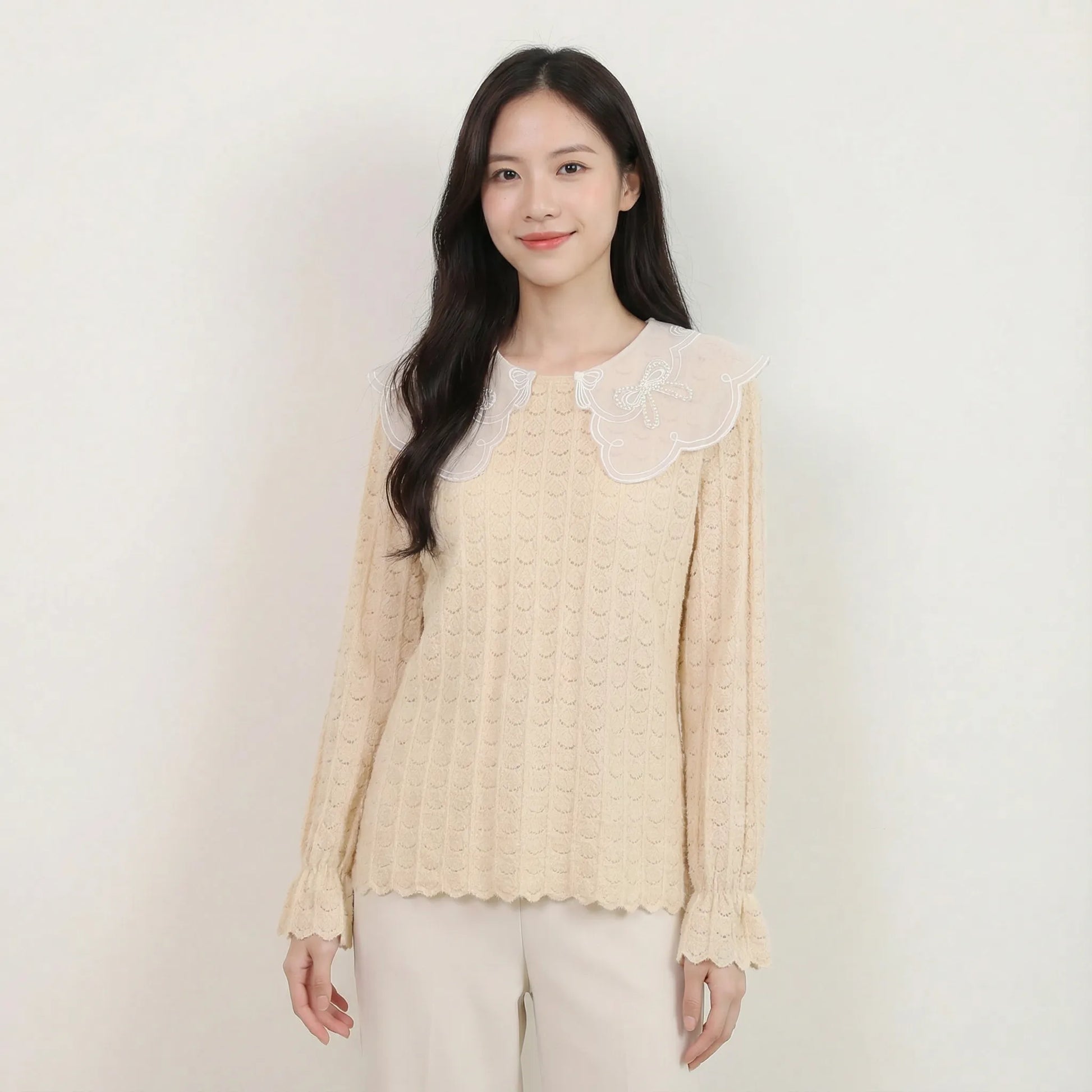 釘珠刺繡領直紋絨面蕾絲上衣