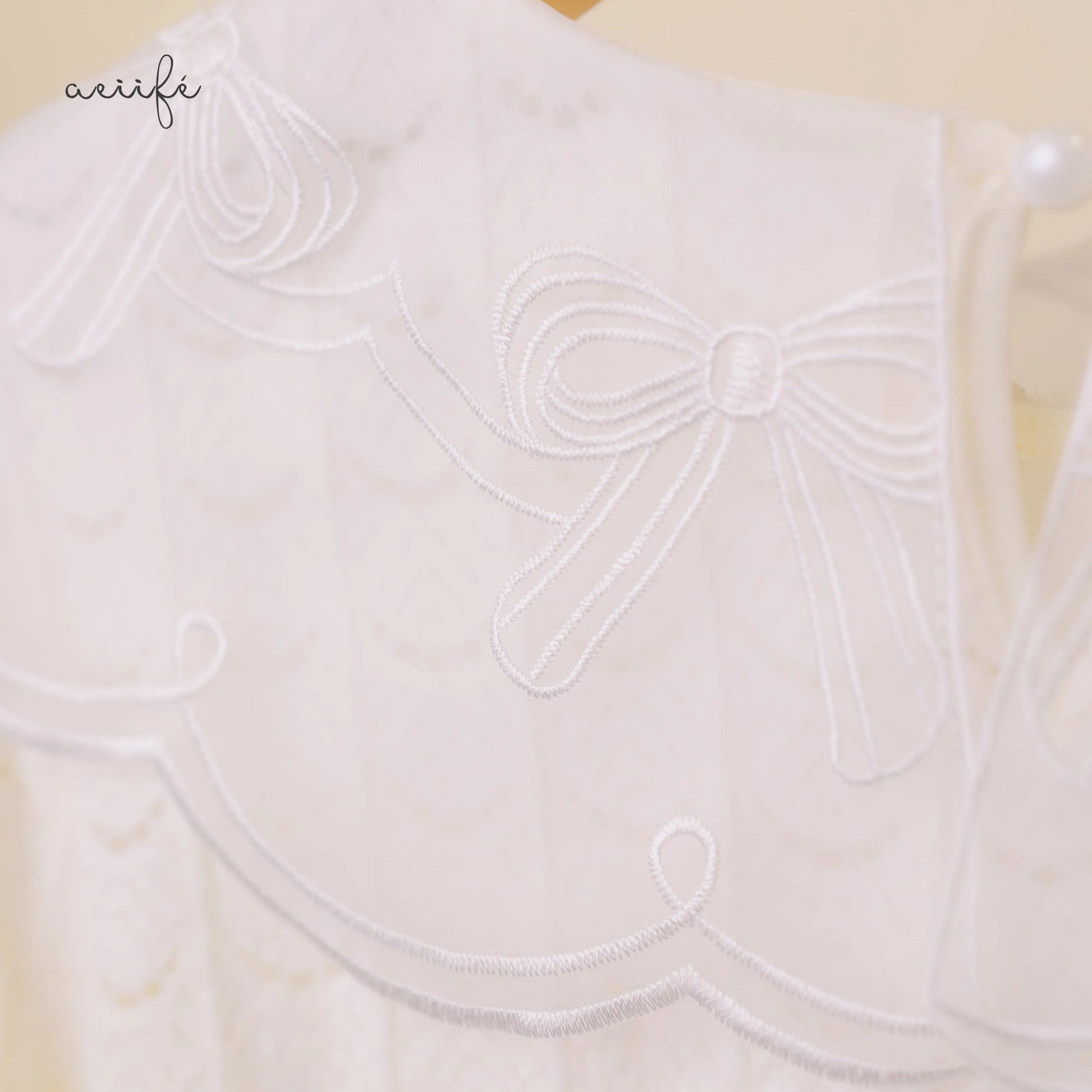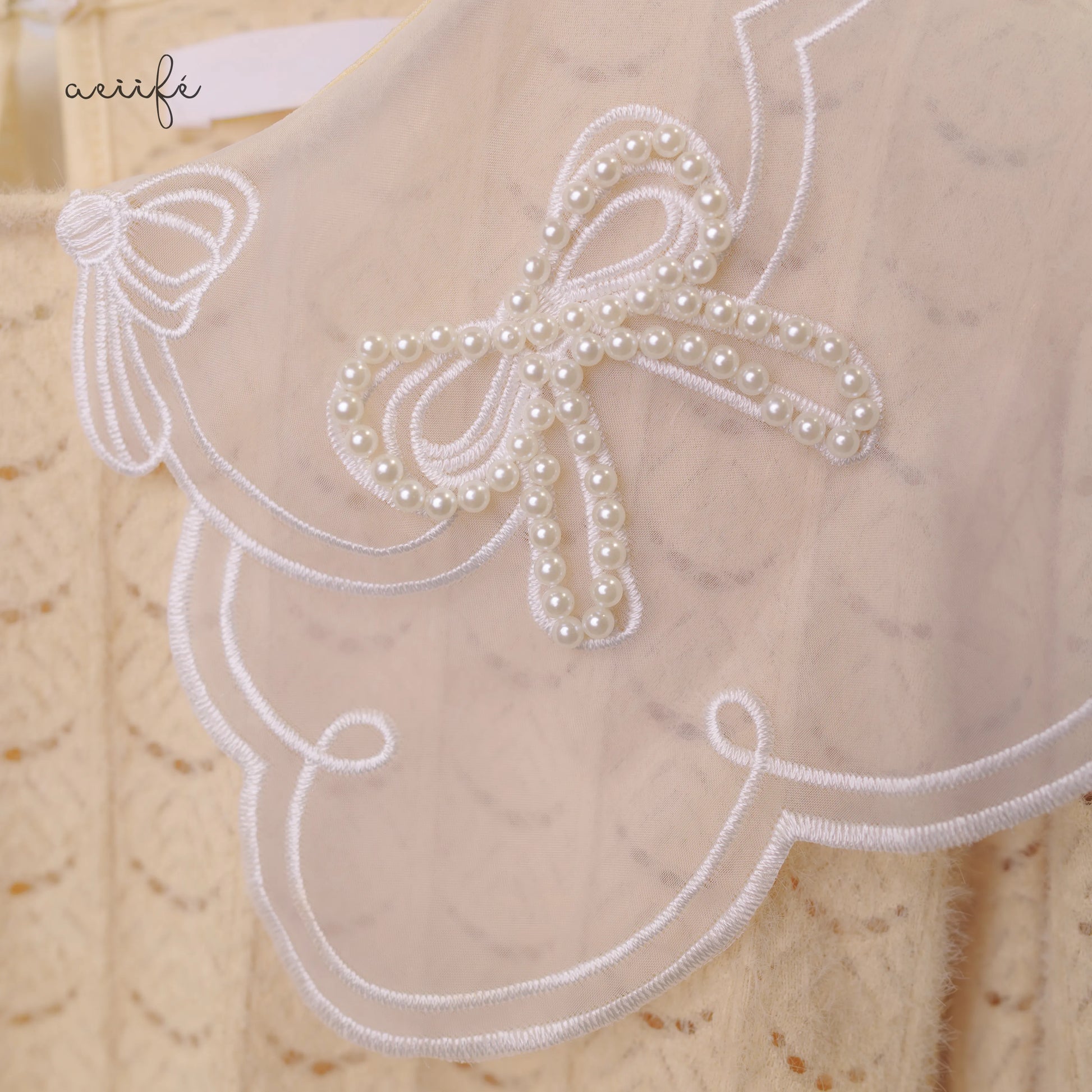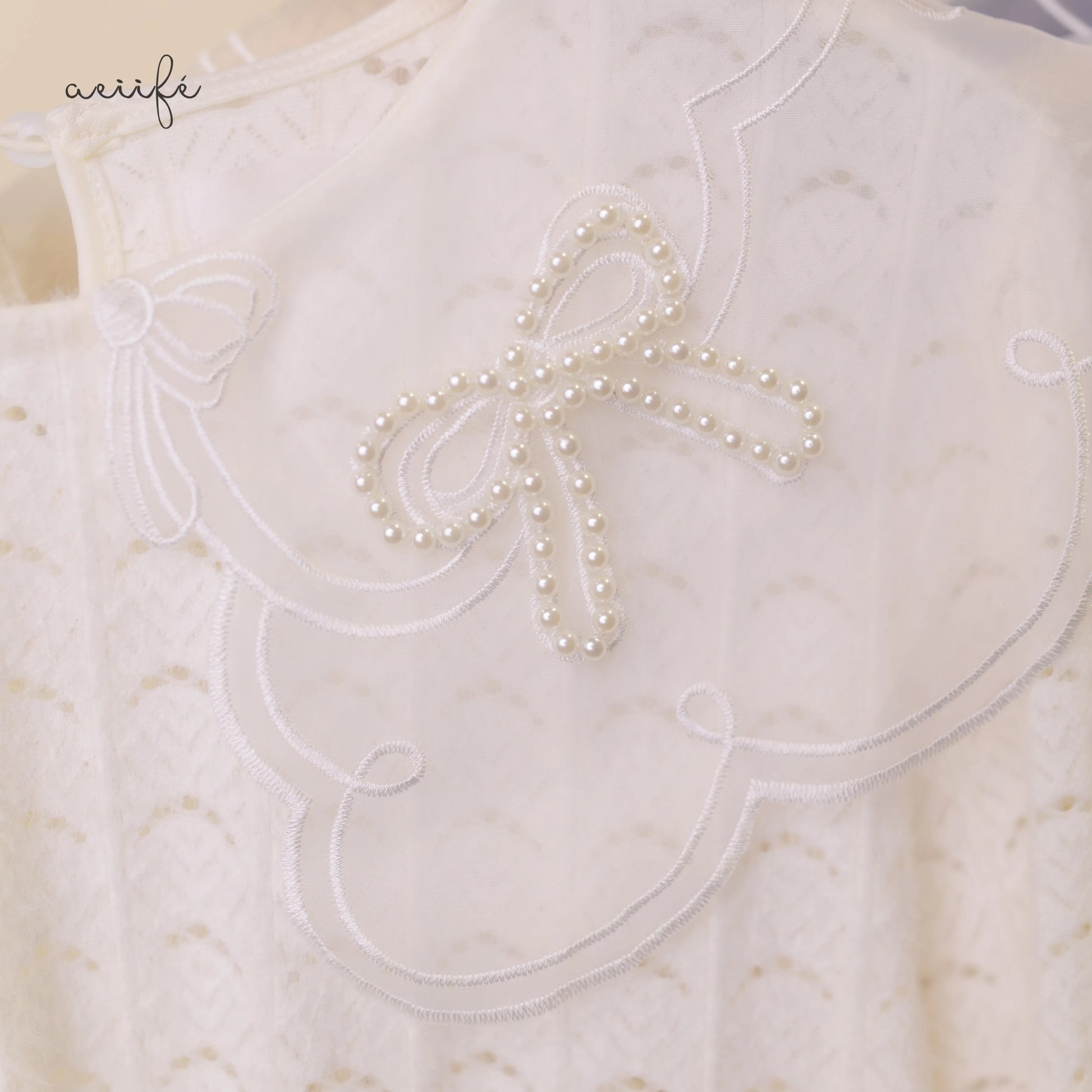 半透白的刺繡、珍珠溫婉細膩的光澤