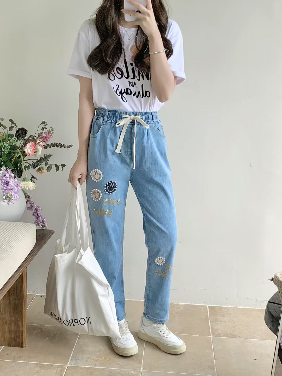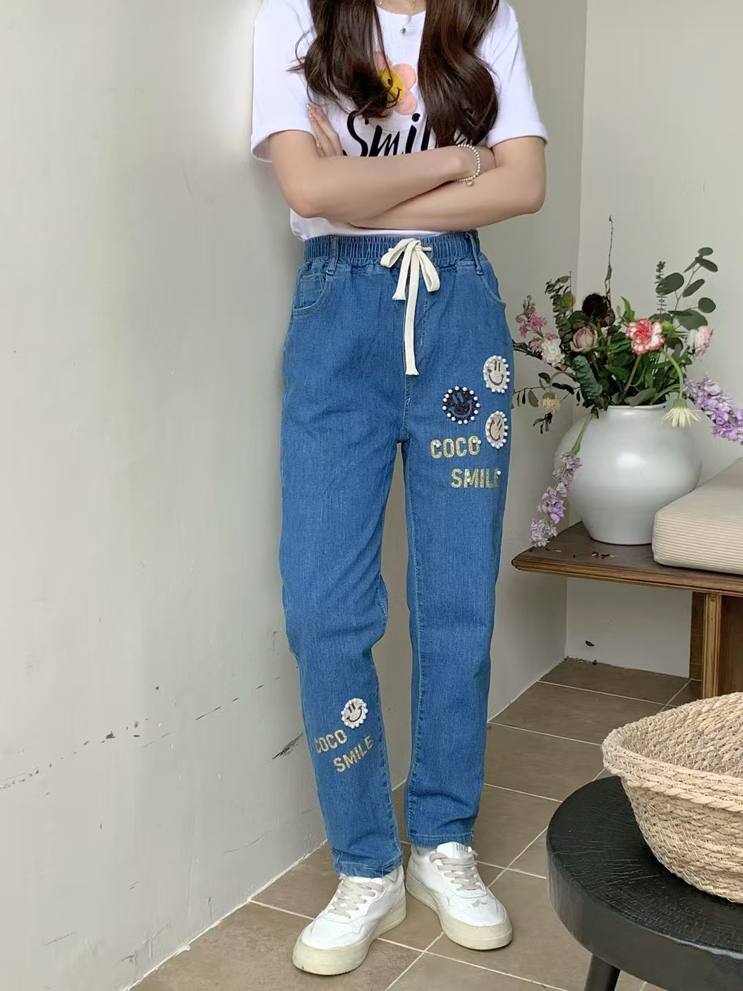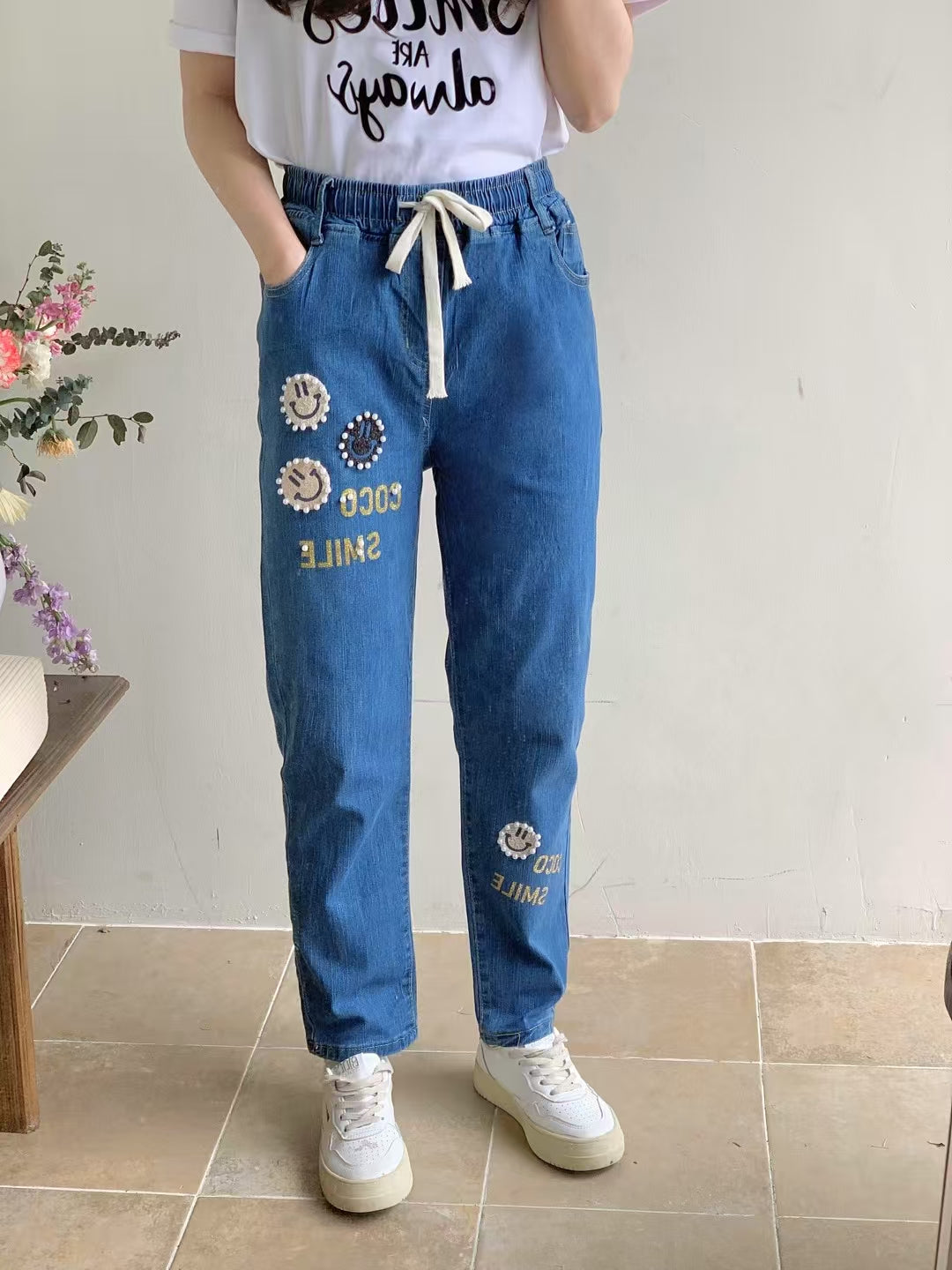 慵懶的笑臉 | 哈哈笑點金字釘珠休閒牛仔褲