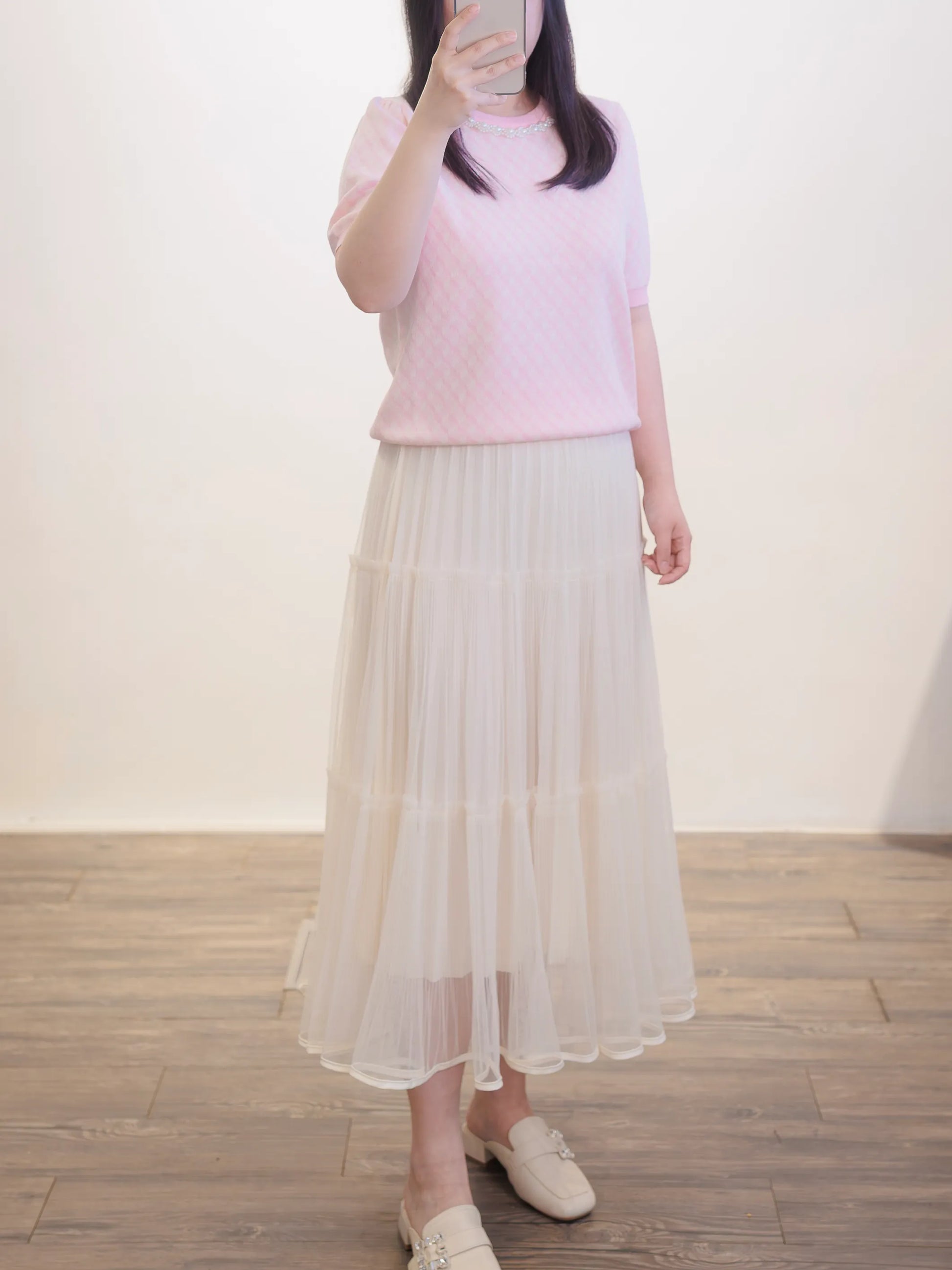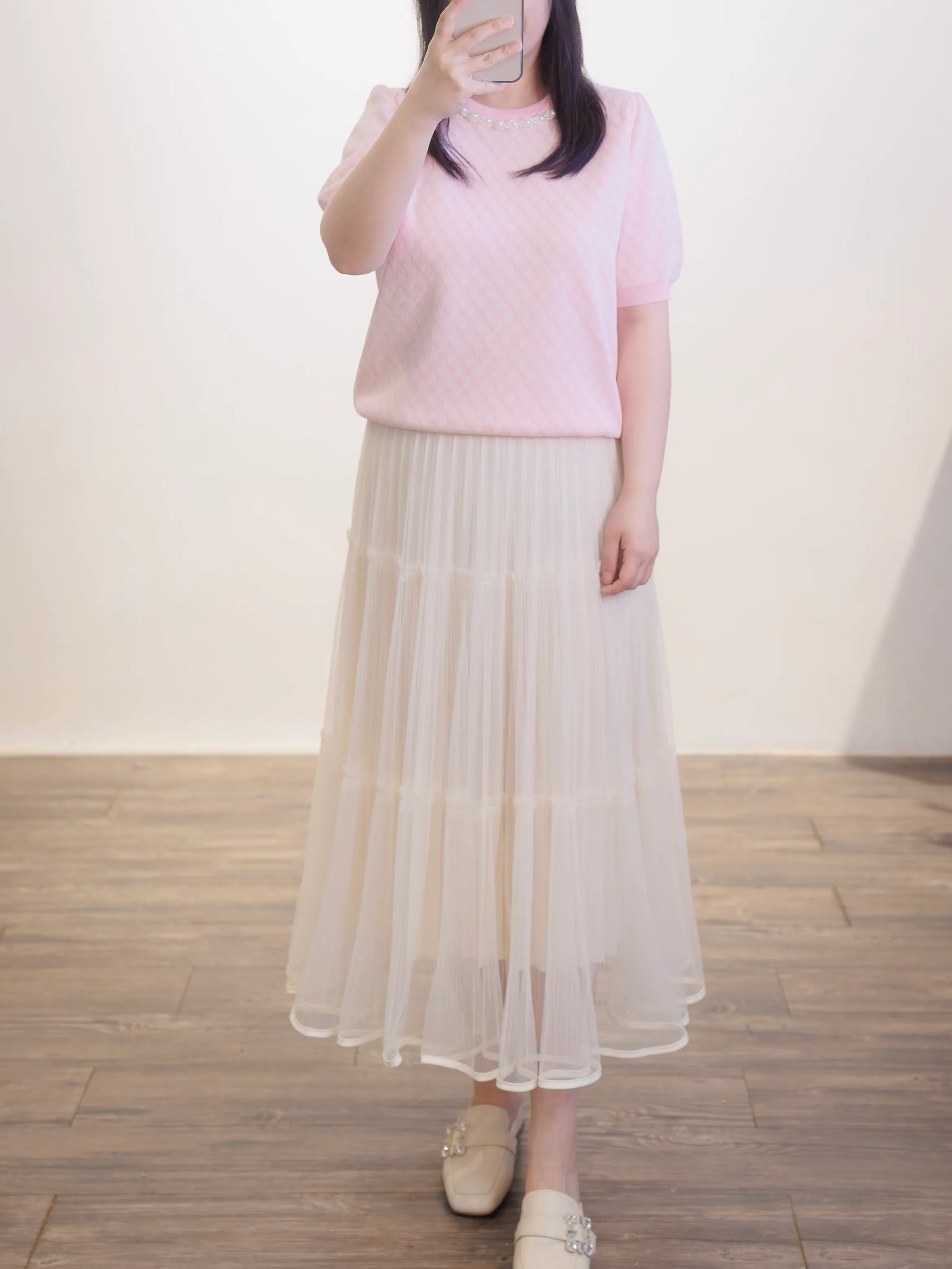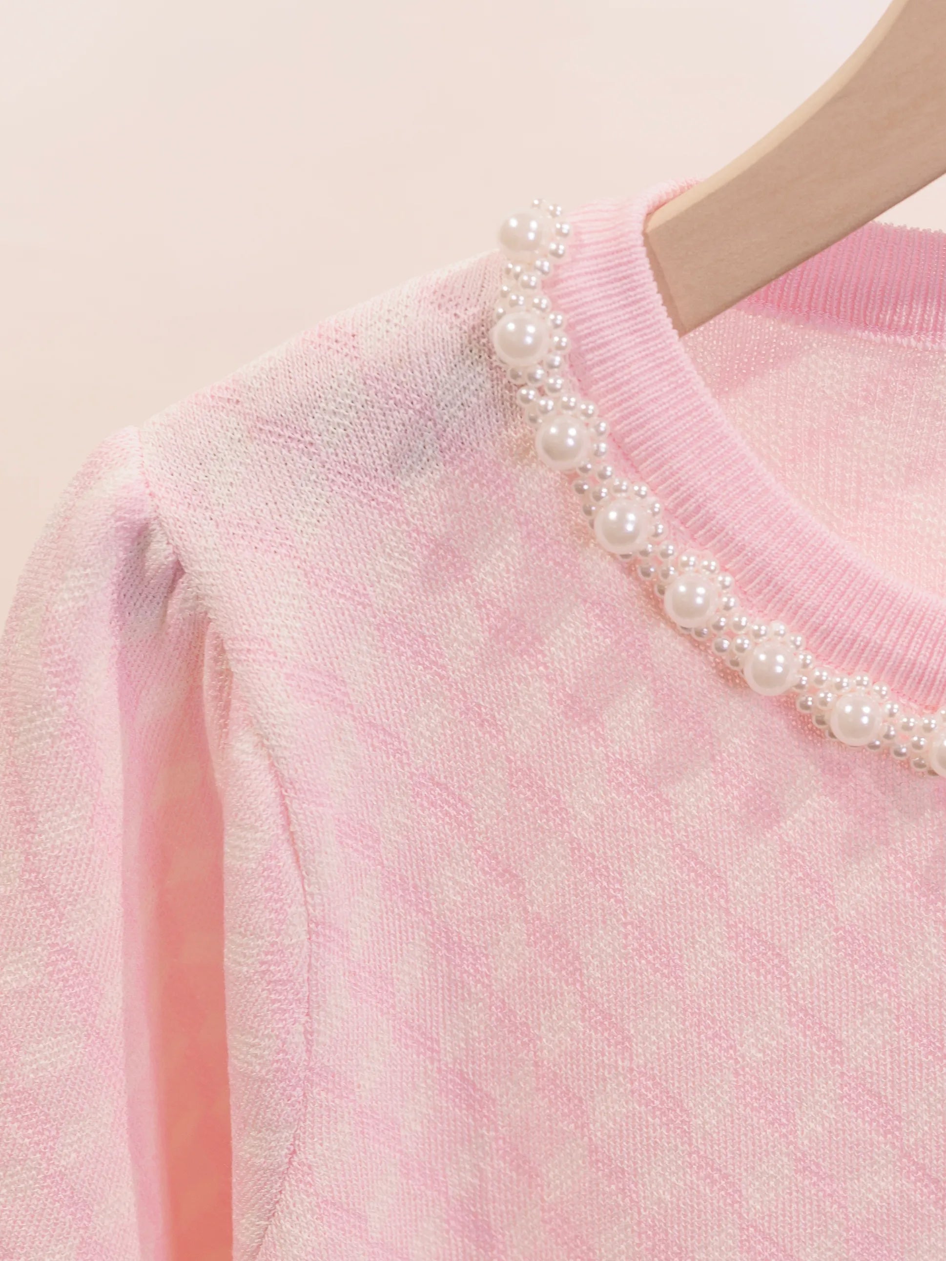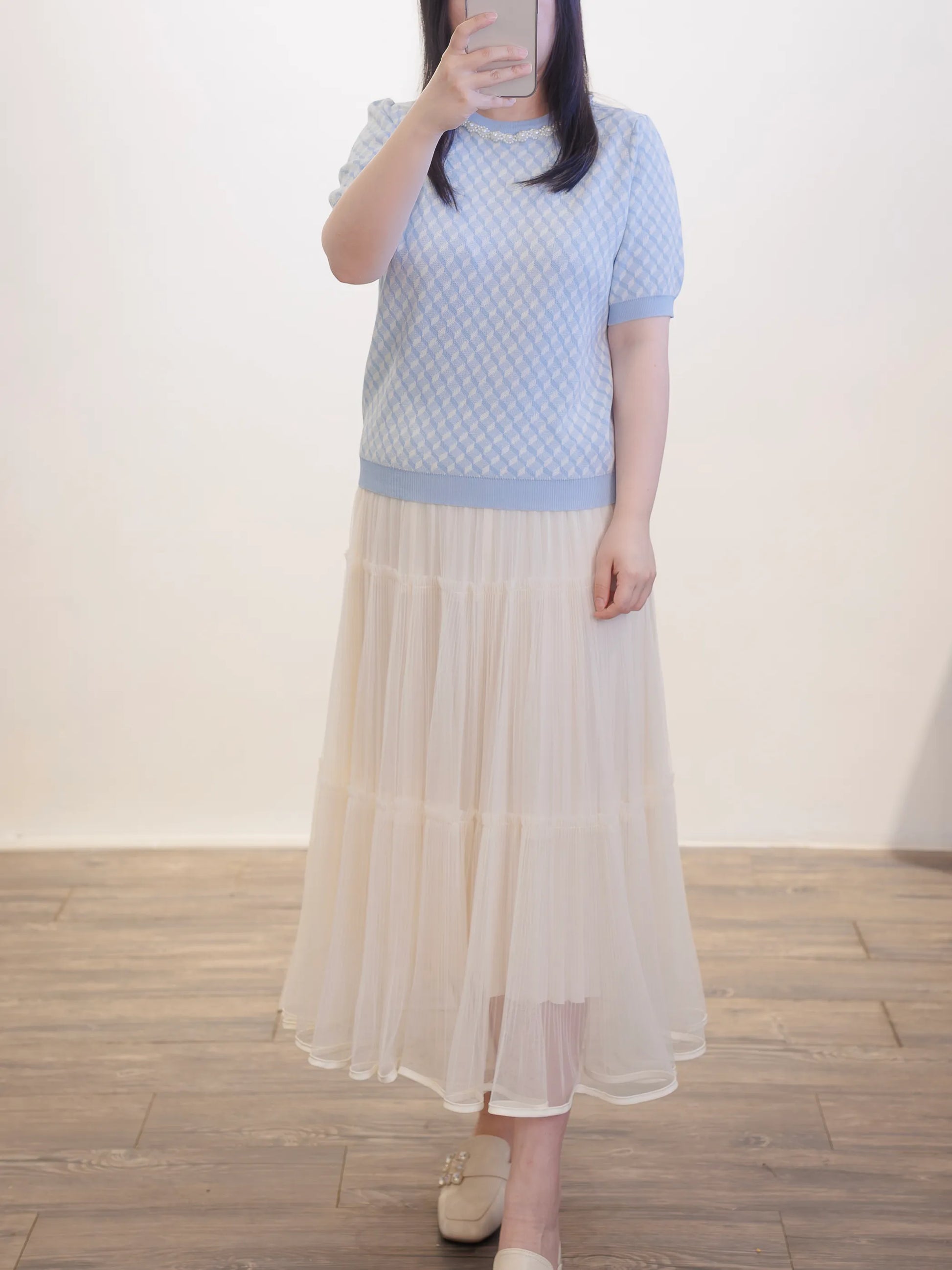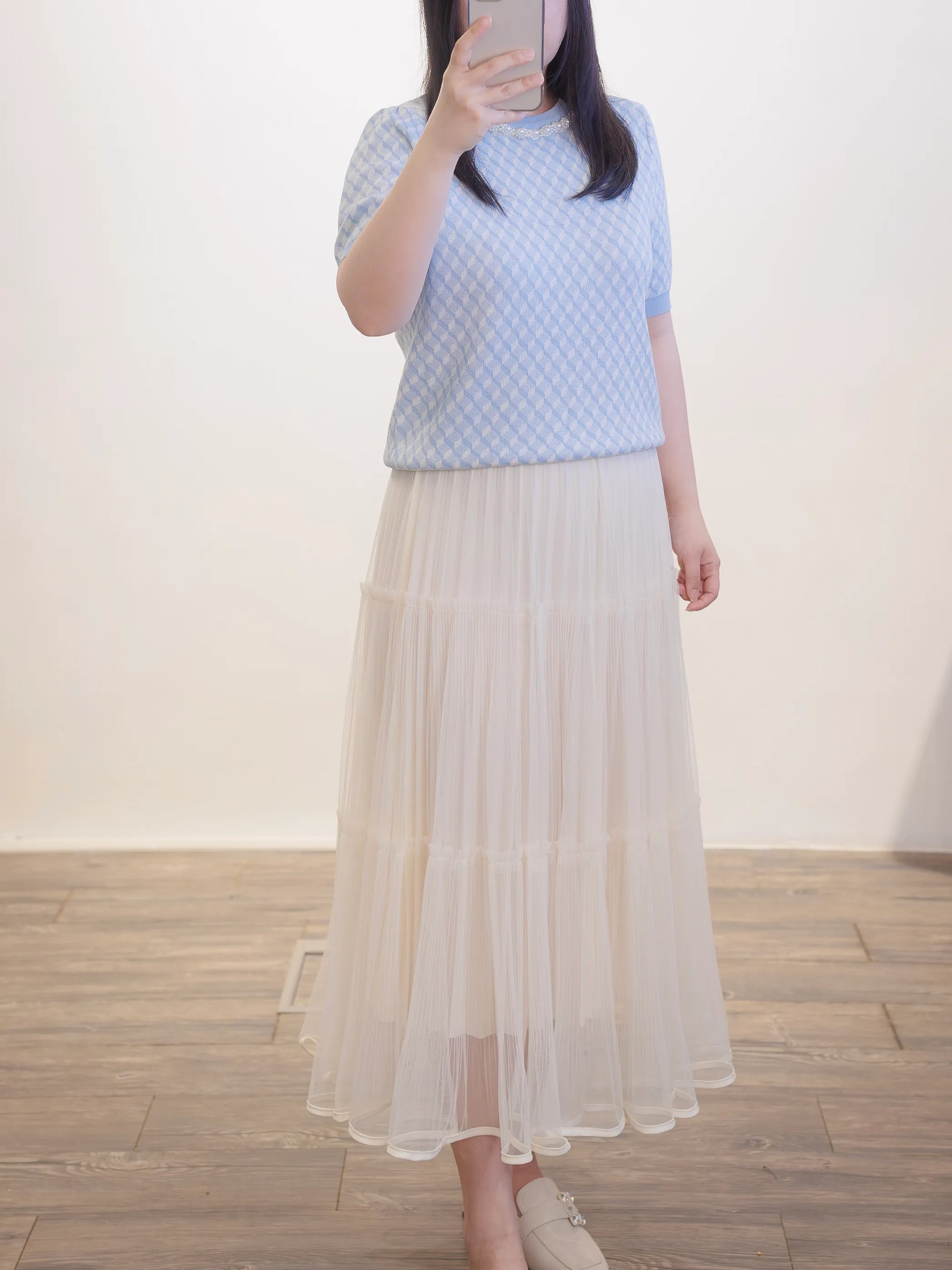恬靜的美術館 | 幾何格紋珠光領冰絲針織上衣